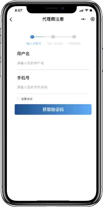 3、输入用户名、手机号码,勾选注册协议,即可获取验证码