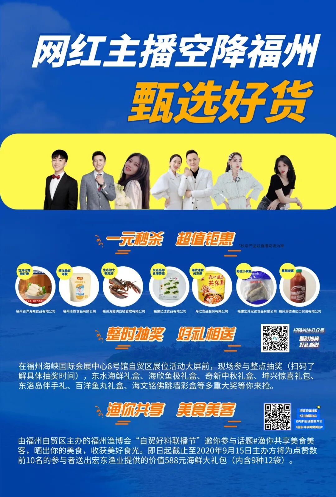 由福州市海洋与渔业局举办的“福渔优品”云购节及福州自贸区举办的“自贸好料联播节”将在9月4日于8号馆正式开幕。活动开展的三天里将进行超低价秒杀活动,线下活动现场每个整点还将进行抽奖活动,将“狂欢”进行到底。